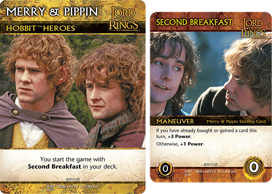 - Second Breakfast: 10th card for starter deck for a player with 'Merry & Pippin' as their hero. Card text: "Maneuver / If you have already bought or gained a card this turn, +3 Power. Otherwise, +1 Power."