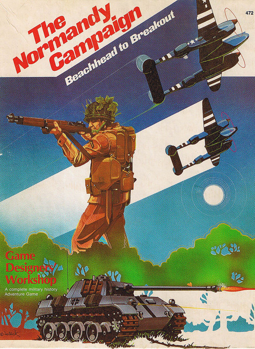 The Normandy Campaign is a two-player game on the fighting in Normandy which occurred after the Allied D-Day landings of June 6, 1944. There are two identical maps, one for each player each hidden from the other. Hexes are 10km, each turn 3 days, counters are from regiments to divisions. Each turn consists of multiple movement and combat phases for each player. Movement into enemy territory is done by stating the hex you wish to enter. The opposing player must state if he has a unit in that hex, if not movement succeeds and may continue. If so, an attack may take place if desired, and may involve multiple units on both sides with the attacker coming from one or more hexes. Units are only revealed during combat. Combat losses are in steps (7-8 becomes 5-8, then 3-8, then 1-8, then elim, etc) and determined by dice on a CRT. Supply, fortifications and air power rules are included. Victory is determined per scenario and is based on liberating cities or for exiting the west edge of the map.