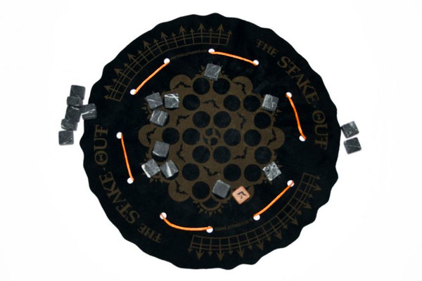 The Stake-Out starts with the Villagers pouring into the Vampire's lair and the unaware Vampire napping peacefully in his coffin. Moving slowly and staying out of the shadows, the Villagers need to surround the Vampire in order to stake their claim. The Vampire flies in shadows, taking out the villagers that stray too far from the group.