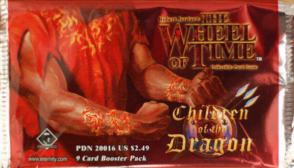 The second expansion to the Wheel of Time CCG, Chidren of the Dragon consists of 150 cards (50 common, 50 uncommon, 50 rares), distributed in 9 card booster packs. This expansion contains new characters and troops for all allegiances in the game including Children of the Light, Aes Sedai, Andoran, Dark One, and Dragon, but with a major focus on the Aiel, featuring all twelve clan chiefs.