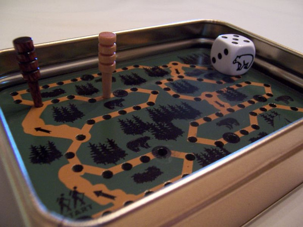 Be the first to move your hiker back to his tent, avoiding the bear dens along the way. This is a basic roll-and-move, follow-the-trail game, which includes shortcut spaces for those fortunate to land on them, and also the Bear Den spaces, which forces the unlucky hiker to re-roll the die and move back the indicated number of spaces.