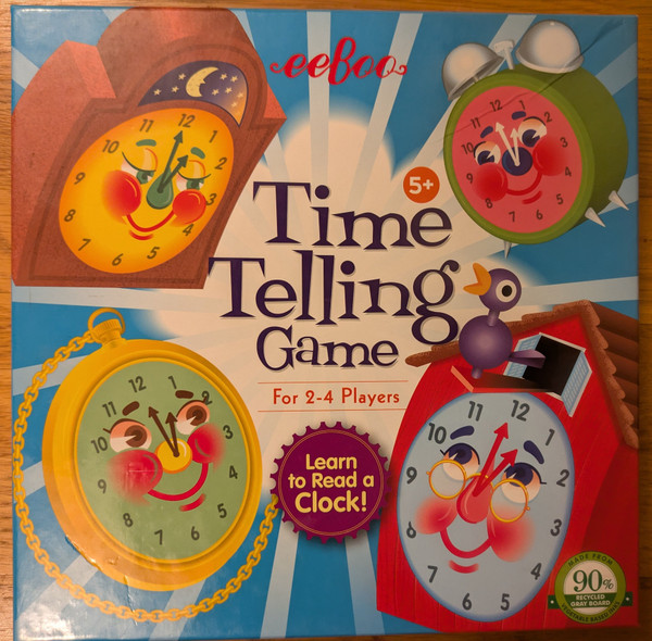 Simple game that helps kids learn how to tell time. Players each get a clock and there are color coded cards with different difficulty levels. A time card is drawn and each player attempts to match their clock with the digital time shown on the card. Once everyone is ready the card is turned over to show how the analog clock should look. Every player that is correct gets a point. There are also rules for single players.