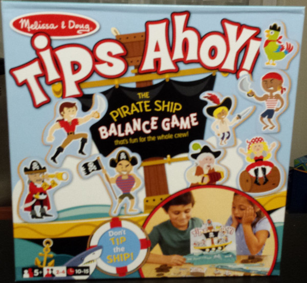 A stacking/balancing game with unique kinetic action. Draw a card to tell you which pirate to pile onto the ship and which water tile to use, then pull the water tile under the ship to make the boat rock on the waves. Try not to let your pirates fall overboard, but you might try to knock off your opponent's! Each player gets one coin for each of her pirates remaining on the ship after movement of the water tile.