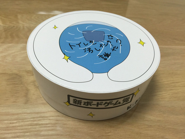 Who Soiled the Toilet? is a deduction game with hidden identities. The game box is 15cm round, not square. The game is published in Japanese with rules available in English, German and French.