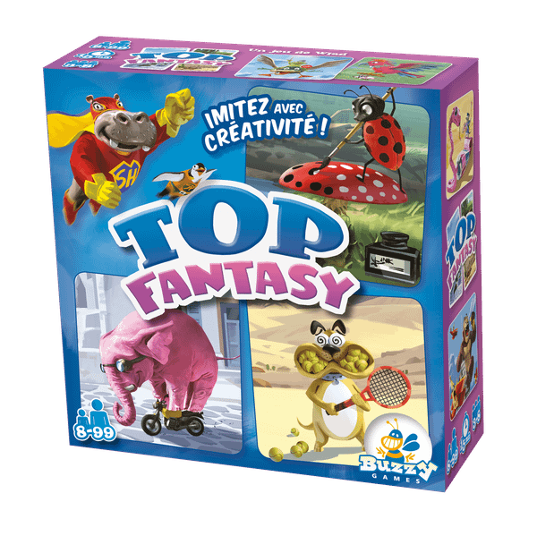 In Top Fantasy one player each round picks a card from the deck, then tries to make the others guess what's shown on this card in the manner indicated on the top card of the deck: using only the hands; using noises and sounds but no words; telling a story about the card; and creating a statue with your body.