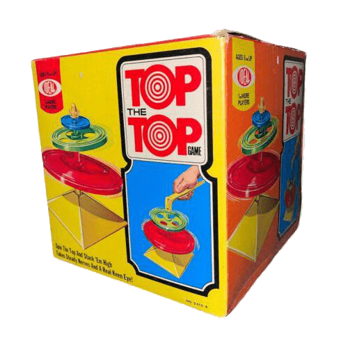 Players take turns trying to get 120 points to win the round or game. Featuring 3 different sized tops, 2 stands, a transfer arm, and 3 small crowns. On their turn, players spin the largest top on the scoring base and then must cap the top with a crown before spinning the next sized top on the spinning platform. Then, using the magnet in the transfer arm, players must get the top to spin on the crown of the previous top and repeat with the third top and final crown before the largest top stops spinning and dumps all of the pieces off. Each top and crown has a point value for the highest level the player achieves on their turn.