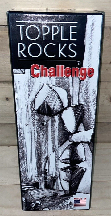 The boxed edition under the title "ToppleRocks Challenge" includes a timer, scoring rules, and is packaged as a game for 2+ players. The bagged edition under the title "ToppleRocks" does not include scoring rules or a timer and advertises itself as a building toy.