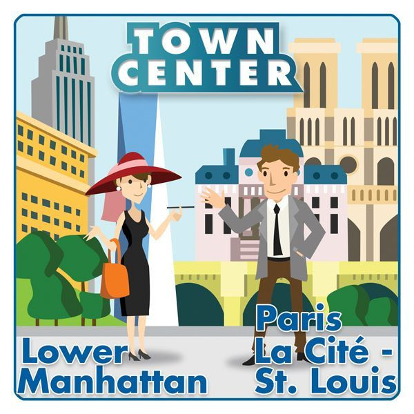 Town Center: Lower Manhattan / Paris La Cité – St. Louis comprises 4 double-sided player boards, with the Lower Manhattan expansion map (previously published separately as part of Town Center: Expansion n°2) on one side, and the Paris La Cité – St. Louis expansion map (previously published separately as part of Town Center: Expansion n°1) on the other. There is also an A5-sized rulesheet that explains the special rules of each map.