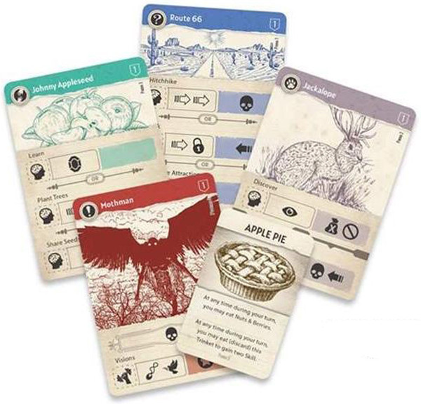 Five extra cards celebrating Americana: Johnny Appleseed (Friend), Mothman (Enemy), Route 66 (Mystery), Jackalope (Beast), Apple Pie (Trinket).