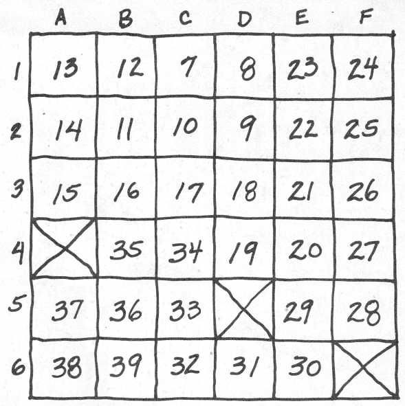 A grid is created by entering a number from 1-25 in any space and then entering the next higher number in an adjacent space, and so on, until most or all of the spaces are filled; some spaces can be filled with an "X" instead of a number, but these cannot be adjacent to each other or the first or last spaces of the "trail."