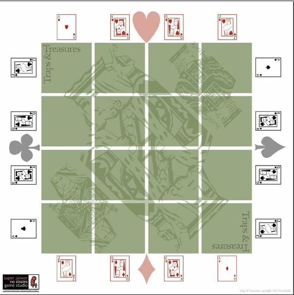 On a player’s turn they must move their pawn and they may optionally make one guess as to where their opponent’s treasure is hidden. To move a player plays one card and moves their pawn to a space in the row (or column) which is labeled with that card.