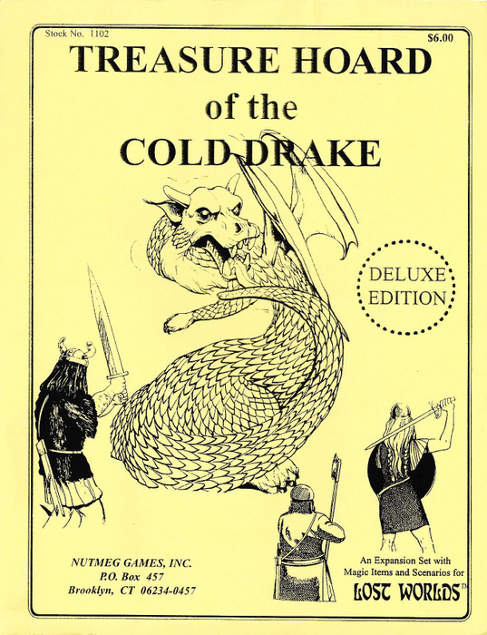 Treasure Hoard of the Cold Drake was a Lost Worlds Adventure Set that used the same plastic "cavern" terrain set originally used in Adventure Set II: The Dwarf and Goblin Wars. The rules specify that the adventure set is intended to be used with 3-4 human or humanoid Lost Worlds characters. However, no metal miniatures or character books were included with this adventure set, so those items would have to be provided by the players.