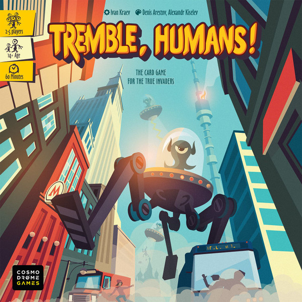Tremble, Humans! Сard Game is a highly thematic board game in which players again take roles of alien generals, invading earth to fill their cargo with intergalactic currency – humans. Each turn of the game some cites are available for attacks and players simultaneously choose a place to attack, splitting their fleet between cites, if necessary. But one city is too small for two generals – so if there are multiple players trying to invade a city, their armies will fight and only the strongest will capture the humans! After the round, generals get support – new ships, as well as the amount of fuel will increase during invasion, making alien fleets larger. After 6 rounds and additional goals scoring the richest player wins.
