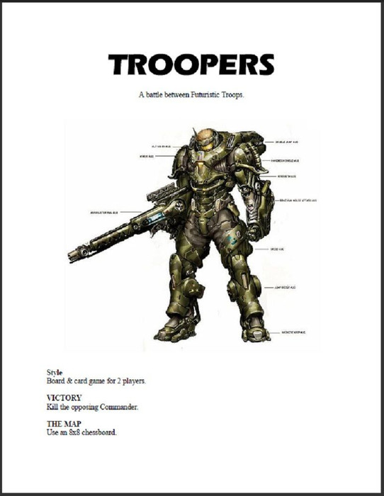 Each side has sixteen units: eight Troopers, two Tanks, two Aircraft, two Hovercraft, one Artillery, and one Commander. The object of the game is to kill the opposing Commander.