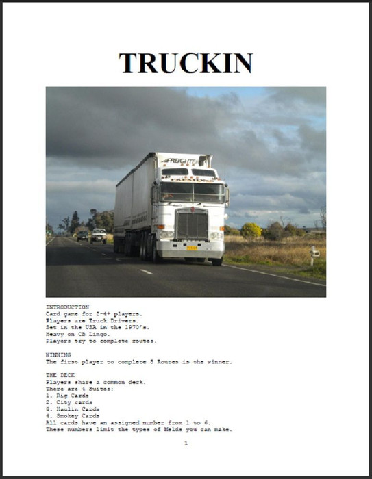 "Card game for 2-4+ players. Players are Truck Drivers. Set in the USA in the 1970’s. Heavy on CB Lingo. Players try to complete routes."