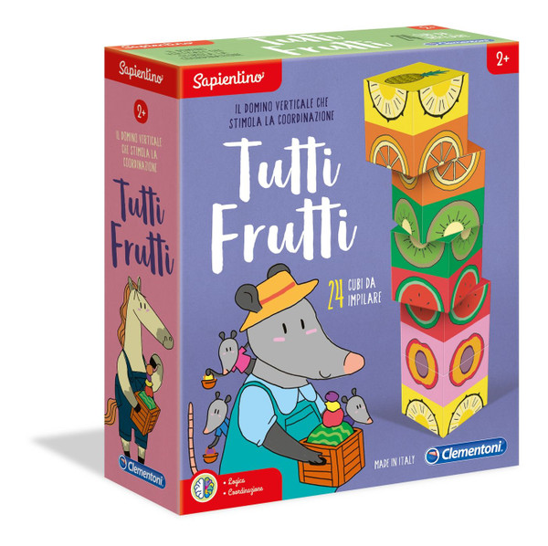 To set up Tutti Frutti, lay out the 48 double-sided tiles on the table; each side of a tile shows half of a fruit. Each player takes one tile at random to start the game. Then as quickly as possible, everyone picks up fruit tiles one by one and adds them to the stack already in their hand — but to add a tile, you must match the fruit half showing on the top (or bottom) of your stack with an identical fruit half on the tile being added. Thus, you're combining the fruit halves to create a whole fruit.