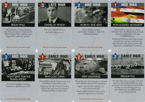 These 8 cards were included as promo decks #1 and #2 with the Twilight Struggle digital Kickstarter. It comprises of 4 card sheets with descriptions of the cards on them, an alternate Space Race Track board, a special Zaire counter to be used on the board if the "Mobutu Sese Seko" event card is activated, and 8 cards: