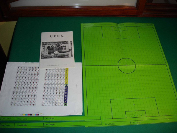 A soccer game simulation. It uses flat cardboard microscopic tokens and mechanics similar to GW's Blood Bowl.