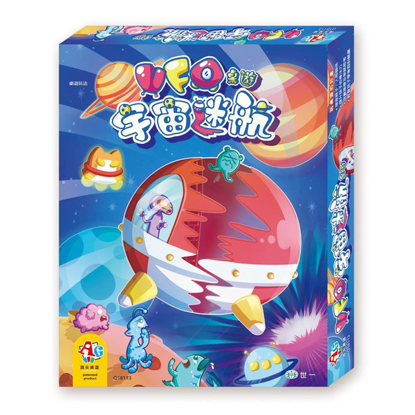 UFOSå®å®è¿·èª (USO Tumble) is an abstract, tile-placing board game. Unlike typical games, it features an unique mechanism: a board that can be turned and rotated, where tiles will fall or not fall depending on their corresponding colors, and re-arranging the module as it goes.