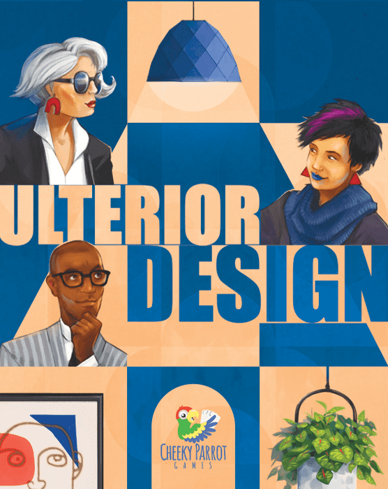 Players start Ulterior Design by revealing one current trend card face up in a central area, then they place one card from their hand face up in their area. On each turn after that, a player plays one of their three hand cards to add to their own house (redecorate), to influence what is trending (by adding a card to the central area), or to sabotage a rival (by adding their card to an opponent's house). Cards are split down the middle with some combination of interior decorations (houseplants, paintings and lamps) on each half, and they must be played so that they overlap at least one half of an already played card.