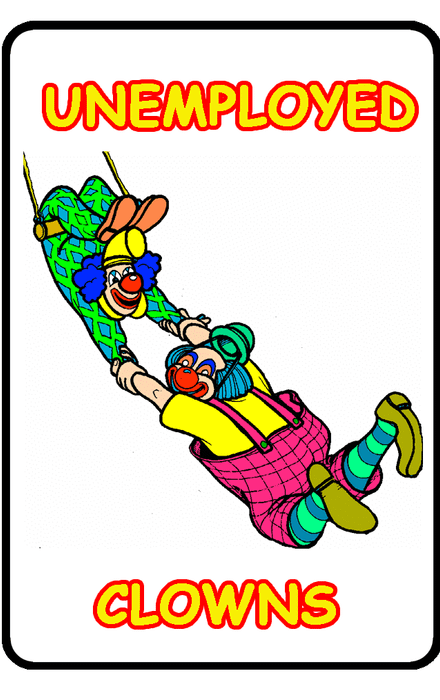 Unemployed Clowns is a game where each player portrays a Clown at the union waiting for a job. Utilizing variable player victory conditions, and a Mafia style deduction element, players will utilize card play to attempt to achieve or avoid work. Any number of players may win since they will have different victory conditions.
