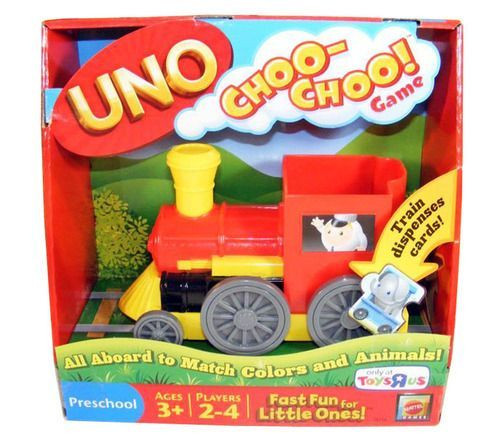 All aboard for Fast Fun for Little Ones with UNO Choo-Choo Game. Preschoolers depart on an UNO adventure featuring a train filled with adorable animals. Play by matching color or animal cards, or play a conductor card he's wild and matches anything! When you have only one card left, cheer 'UNO Choo-Choo!' to let everyone know the winning train is leaving the station! Includes 28 cards, 4 caboose partitions and train. For 2 to 4 players. Ages 3 and older.
