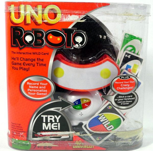 For the first time ever players are able to customize and personalize their UNO game with UNO Roboto. Record each player’s name and set unique house rules, then let UNO Roboto get the party started with surprise commands and funny phrases that change-up the game every time.