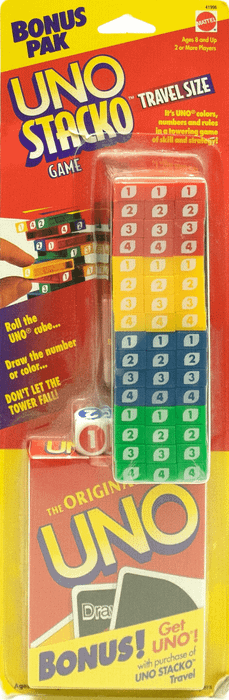 A bundled set of the UNO Stacko dexterity game and the UNO card game.