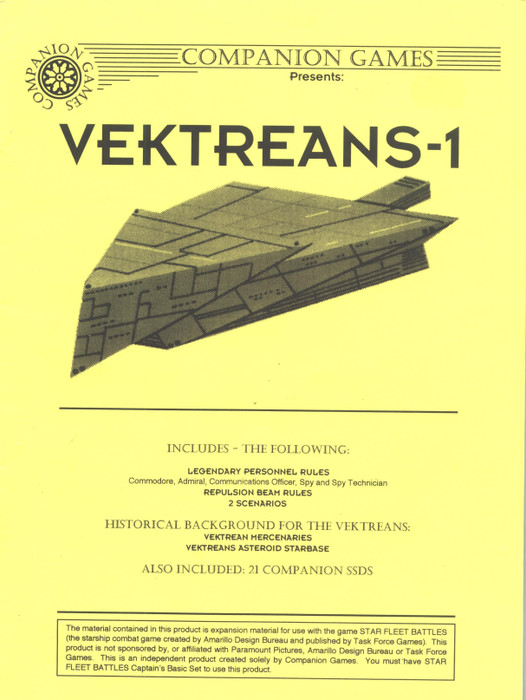 This is an expansion for the game Star Fleet Battles Captain's Edition that introduct the Vektreans race. The Vektreans are a mercenary race mainly located in the "Far SIde of the Galaxy" area, that is the area where the Comapnion Games located the races of her develoment. This race, as the Argonians, has a branch that moved to the standard Star Fleet Battles area.