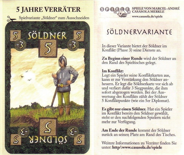The Verräter Söldnervariante (mercenary variant) was available at Spiel 2003 celebrating the 5 year anniversary of Verräter. The Spiel 2003 edition was printed on a postcard along with advertisements for games by Marcel-André Casasola Merkle: Verräter, Meuterer, Attika, and Attribut. The Söldnervariante was also made available as downloadable file by Lookout Games.