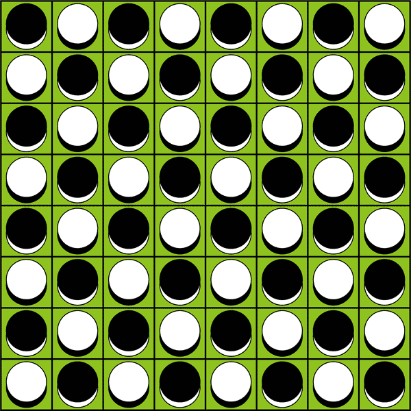 As setup, arrange 64 double faced disks as the checkers pattern (as the diagram above). The object is to connect all your color orthogonally on the board.