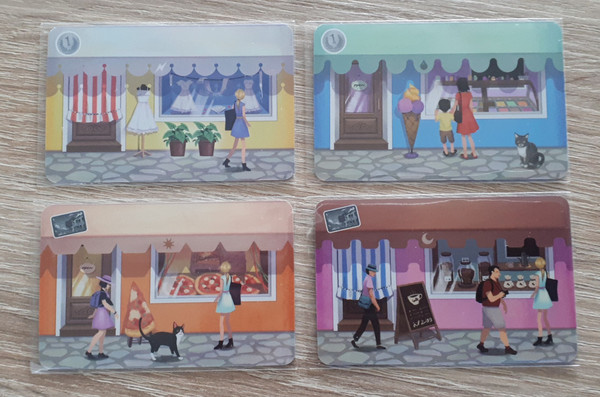 This 2018 Essen Promo contains 4 additional shop cards, each with special bonuses (extra coin or extra building card). They can be shuffled into the base game's ground level deck for more variety and extra options.