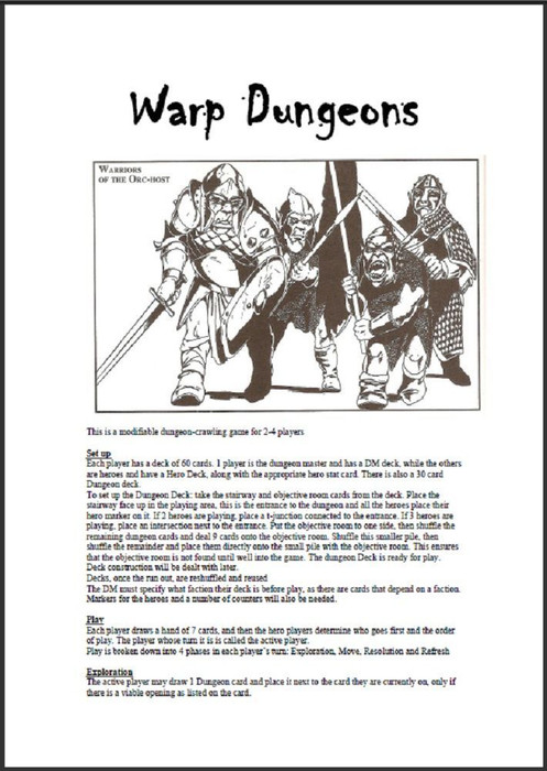 The Dungeon Deck consists of cards specifying rooms and passages which are used to randomly create the dungeon. A Hero Deck consists of cards for various actions and treasures. The DM Deck consists primarily of cards representing monsters and traps.
