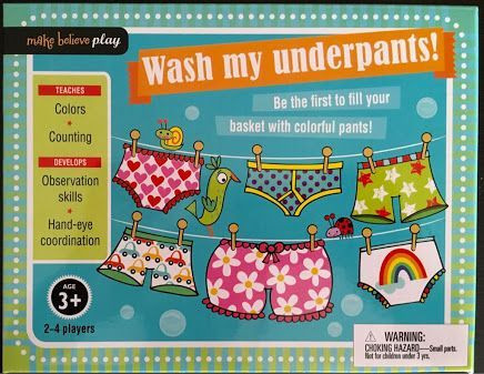 The Wash My Underpants Game is an exciting early learning game which teaches color recognition and matching, provides practice in counting, encourages observation skills and develops hand-eye coordination.