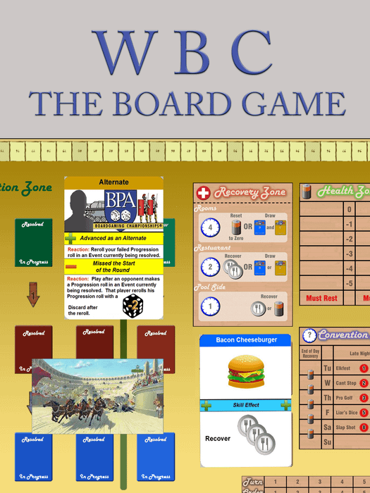 WBC-The Board Game is a game for 3-5 players, who will share the fun of the week-long World Boardgaming Championships, contesting convention events in a quest for Laurels and competing for the ultimate prize: The title of Caesar. Players must manage their time wisely. They must remember to carve out a moment between games to sleep and eat while dodging convention pitfalls – including other competitors, unfortunate circumstances, and the occasional dreaded phone call from home. After six days of gaming -- when the games are all packed up and the competitors are headed for home – WBC players compare accumulated Laurels. Highest score is Caesar, a proven boardgaming champion worthy of praise!