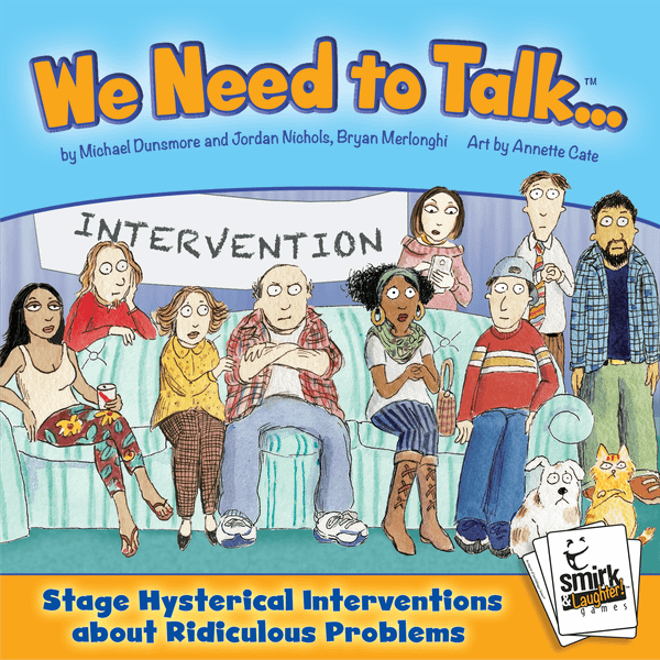 In this game, players take turns being the focus of an intervention by drawing a Problem card with a nonsensical problem like, "Uncontrollable Interpretive Dancing" or "Neurotic Inability to Turn Right". They can't see the card, but all the Concerned Friends and Family can. Friends will give obscure clues that hint at the problem, without giving it away. The sooner the Intervened can guess the problem, the more points they'll score. The longer the Concerned Friends keep them guessing, the more points the Friends can earn. Each of the three rounds have a unique format for giving clues, Broaching the Subject, The Emotional Appeal and Offering a Solution. But if the Intervened cannot guess their problem by the end of the third round, no one will score any points, having failed to help their friend.