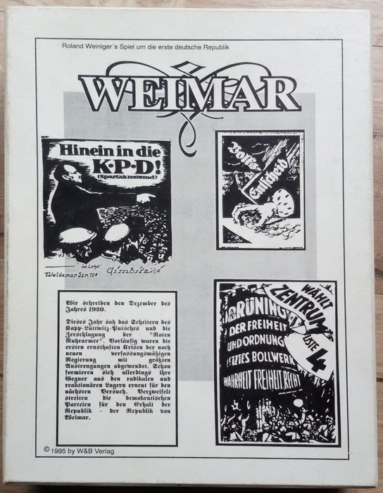 This game captures the political and economical going-ons of the first German republic (the so called "Weimarer Republik") from 1920-33. Players take the roles of one of the major political parties (from communists down to the Nazis), trying to win elections and have their politicians in the government. Laws are made in a roleplaying style, which change the rules of the game and influence the economics and life in Germany, while there are still reparations to be paid, and inflation threatens the economic stability.
