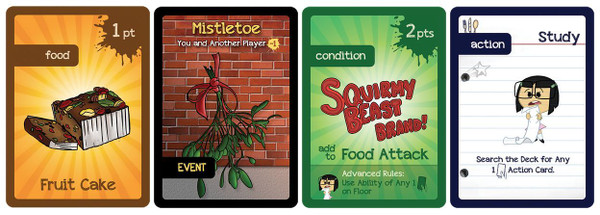 Funded on Kickstarter, What the Food?! is a fast playing card game for 3-8 players. These 4 special bonus cards were created as a thank you gift to backers and specifically for the BGG store. Includes an action, food, condition and event card to spice up your holiday games!
