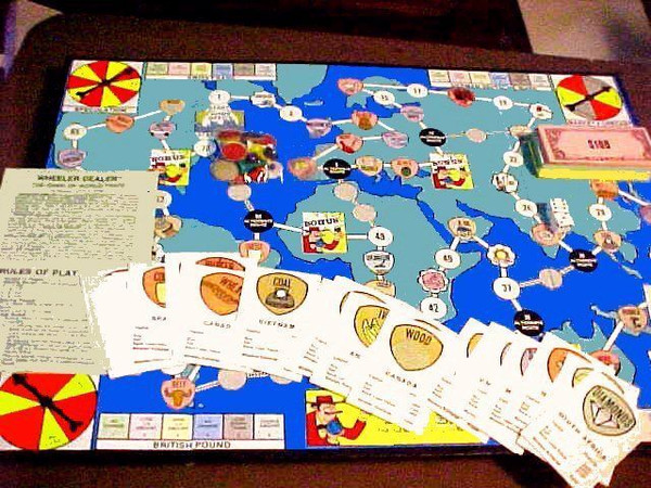 Wheeler Dealer is a game of two parts. In part one players travel the world while buying, selling, bargaining and trading world products. In part two the products are sold back to the bank or auctioned to the highest bidder