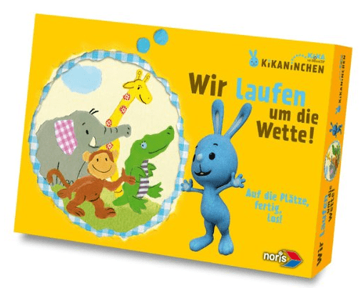Kikaninchen is the identifaction character for the children’s TV channel of ARD and ZDF. In this roll-and-move game KiKaninchen and his friends want to fill the empty harvest basket with apples which they want to pluck from the tree on the last track card. Players must bet on the winner of the race and the winner of the game is the player who has guessed the winner. Between the start card with the basket and the finish card with the tree you place any number of cards you like. Each player chooses one of his color dots and thus bets on the animal that will reach the finish first. In turn each player takes both dice and moves the animal of the color rolled as many steps ahead as the number dice die demands. When you roll red the player puts back an animal of his choice the rolled number of steps. When the first animal reaches the tree the winner is the player who chose this color dot.