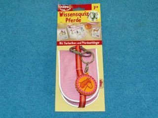 A trump and guessing game on 32 horse races, the cards show a number range, the name of the race, the size and weight of the animal, the colours of the coat and the age of the race. The cards are dealt, in his turn a player rolls the die and depending on the roll he chooses a very big or a very small number from the information on his cards, the next player answers with his biggest or smallest number in the same category. The player with the highest or lowest number respectively wins both cards. If one player has run out of cards, the player with the most cards wins. Packed in a belt bag, with key ring horse pendant.
