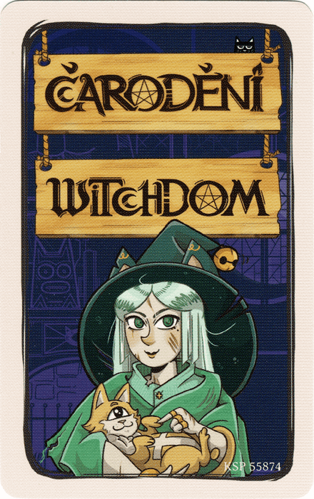 A set of 11 cards: cover card with rules on the back, 5 witches and 5 potions.