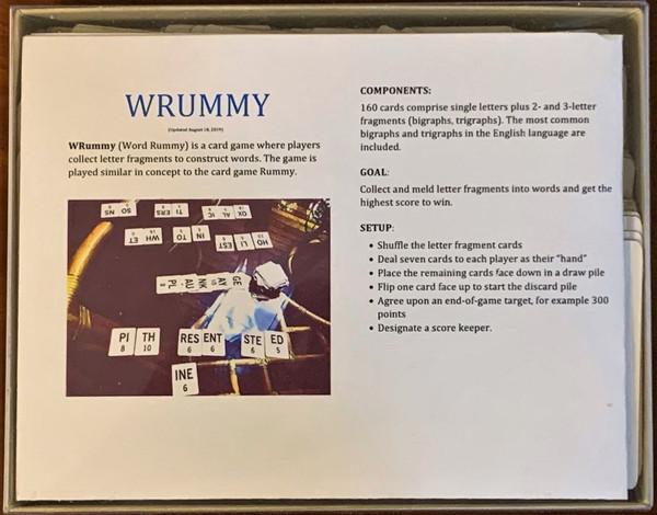 Wrummy (Word Rummy) is a card game where players collect letter fragments to construct words. The game is played similar in concept to the card game 500 Rummy.
