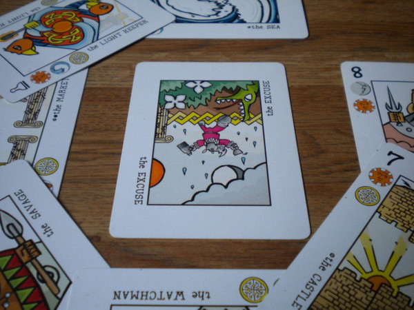 You are a great mage, represented by the excuse, taming the wyvern; put it in front of yourself in a way that the little fool is standing up. As the mage you need to create a ring of protection before the wyvern breaths fire upon you. Well a wyvern, or a balrog, or whatever please you because the nature of the Decktet you could represent whatever battle, or characters, or universe that please you, well, always when the story to represent must be the creation of a protection against a superior physical or magical power.