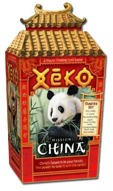 The Mission: China Starter Set comes in a pagoda-roofed box made from recycled paper. Includes an oversized playmat with an eco-map on the back, 43 cards (4 Endangered, 14 Rare, 23 Common, two limited-edition sketch cards) for a 2-player game, giant learn-to-play cards, and a rulebook Xeko cards are printed on recycled paper with eco-friendly inks. Xeko donates 4% of game net sales to Conservation International.