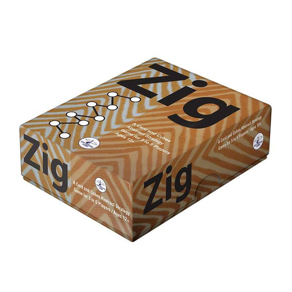 Zig is a game of cards and cubes for three to five players in which each player is attempting to acquire sets of colored cubes to score points. The card play is unique in that a pair of "Zag" cards is played to a mat in such a way that a connection is made between verbs, numbers, and colors. These combinations result in the exchange of cubes, and aside from a point value, these cubes can be used to purchase additional cards, thereby forming new connections in the next round. Can you utilize the available "Zigs and Zags" effectively to gain more points than your opponents? You have only nine turns to find out!
