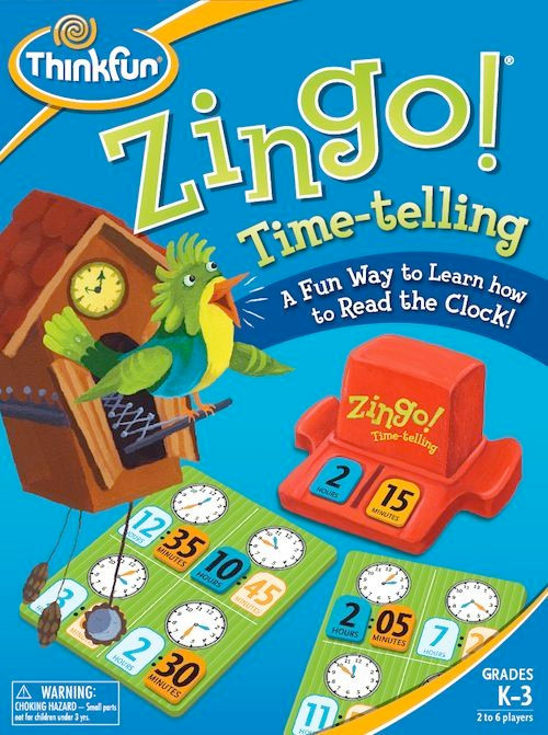Zingo! Time-telling works like other Zingo! titles from ThinkFun in that it has a chunky plastic device that spits out two tiles at a time for players to use. In this game, players try to find hour tiles and minute tiles to match the analog clocks depicted on their individual player boards. If the clock shows, for example, "7:20", then you must find the "7 hour" tile and "20 minutes" tile in order to complete it. The first player to complete her board wins!