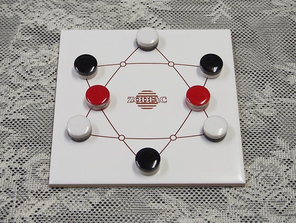 ZODIAC is a game of formation with own pieces and neutral pieces. The winner is the player who has more pieces (more than 3) when all 6 intersections around the center are filled with pieces.
