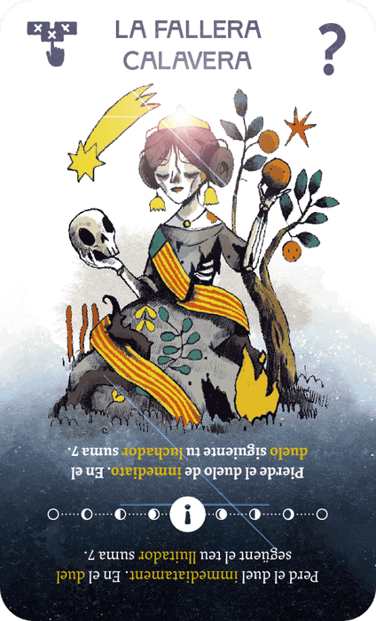 If played as a fighter, La Fallera Calavera will "revive" any fighter that lost a duel (yours or from your opponent) and you will use that fighter for the duel, removing La Fallera Calavera from the game. If played as a star, you lose the duel inmediately, but on your next duel your fighter has +7 power.
