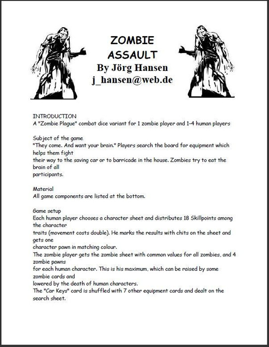 "They come. And want your brain." One to four human players search the board for equipment which helps them fight their way to the saving car or to barricade in the house, while the Zombies try to eat the brains of all the humans!